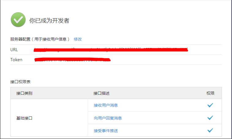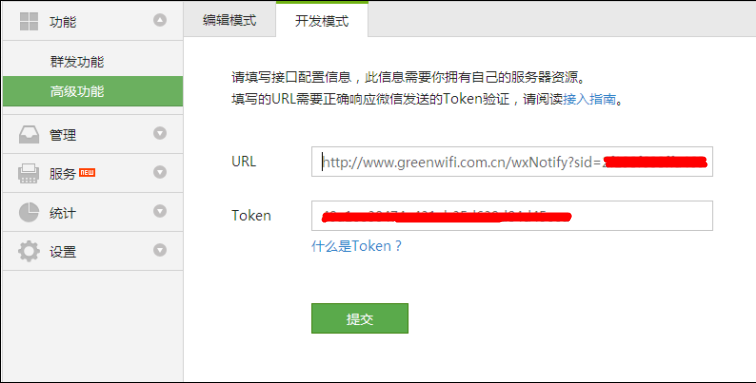 4、在开发模式“接口配置信息”中输入URL和TOKEN,商家可以认证设置界面中查看自己的URL和TOKEN,完成后提交设置。