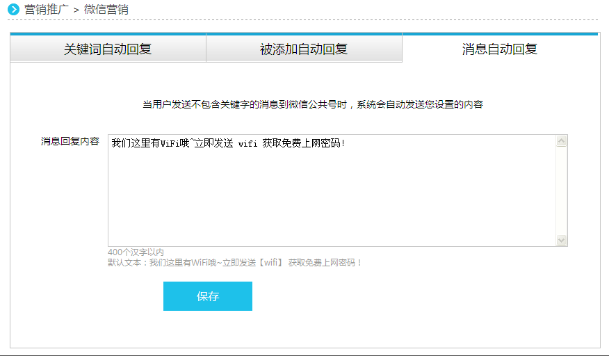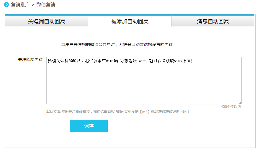 1、进入科硕WiFi营销管理平台“微信营销”,默认进入微信关键字设置。访客向商家公众账号发关包含关键字的内容如:“wifi”,将收到商家设定的回复内容。回复内容中包含“#wifi密码#”,访客将收到上网密码和上网时长提示。